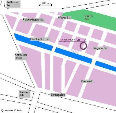 Unsere Geschäftsräume befinden sich in Berlin-Kreuzberg in der Liegnitzer Strasse 26. Diese liegt in der Nähe vom Kottbusser Tor zwischen dem Paul-Lincke-Ufer und der Reichenberger Strasse.